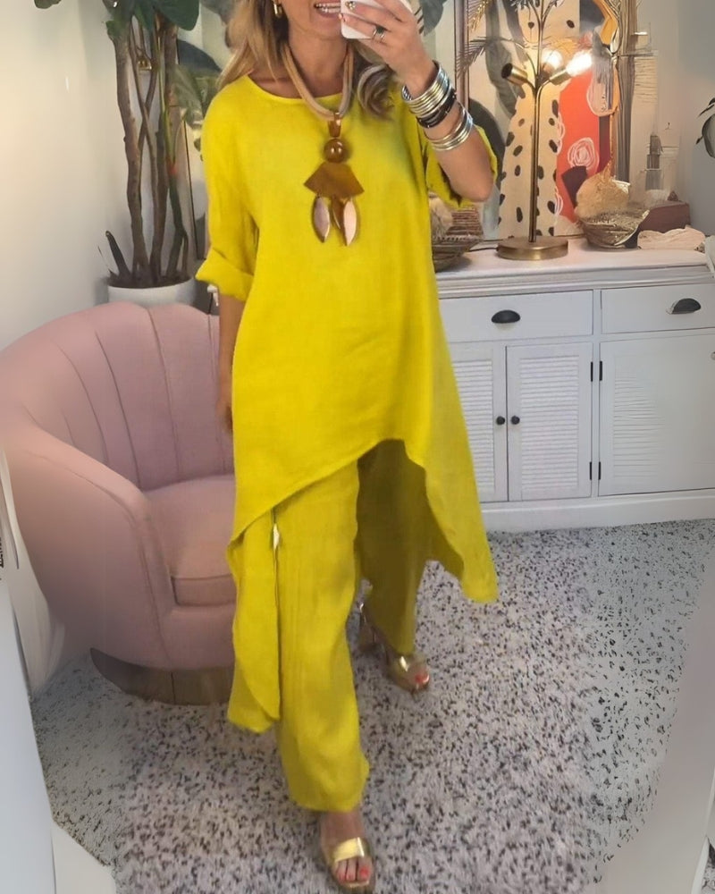 Perfekt für diejenigen, die einen leichten und gemütlichen Look schätzen, kombiniert dieses Set die Weichheit von Baumwolle mit der Frische von Leinen und sorgt für Wohlbefinden bei allen Anlässen.