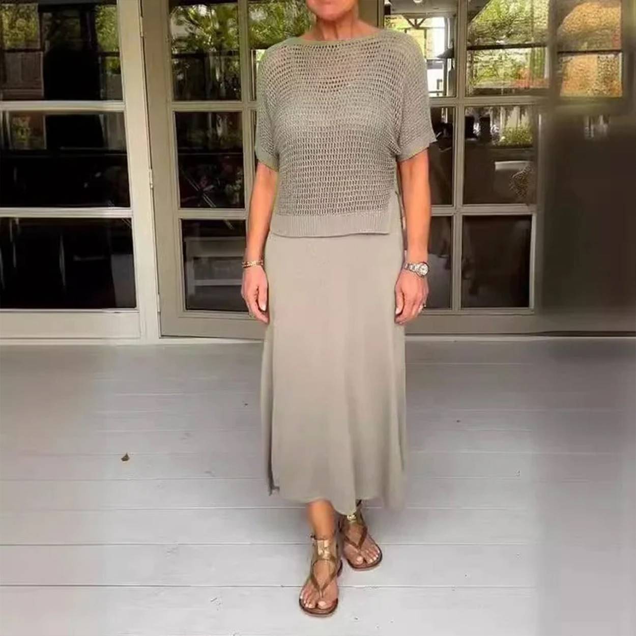 Verschönern Sie Ihren Alltagslook mit dem Alma™ Eleganten 2-Teile-Set, das entworfen wurde, um luftigen Komfort mit zeitloser Raffinesse zu vereinen. Dieses schicke Ensemble besteht aus einem perforierten, kurzärmeligen Oberteil, das mit einem langen, fließenden Kleid kombiniert wird – ideal für alles, von Tagesbesorgungen bis zu Abendessen.